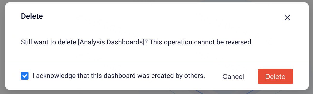 When project owner and root try to delete a dashboard created by others, alerts will be shown and confirmation will be needed to continue the action. Once deletion is completed, the asset owner will receive notifications on the action.
