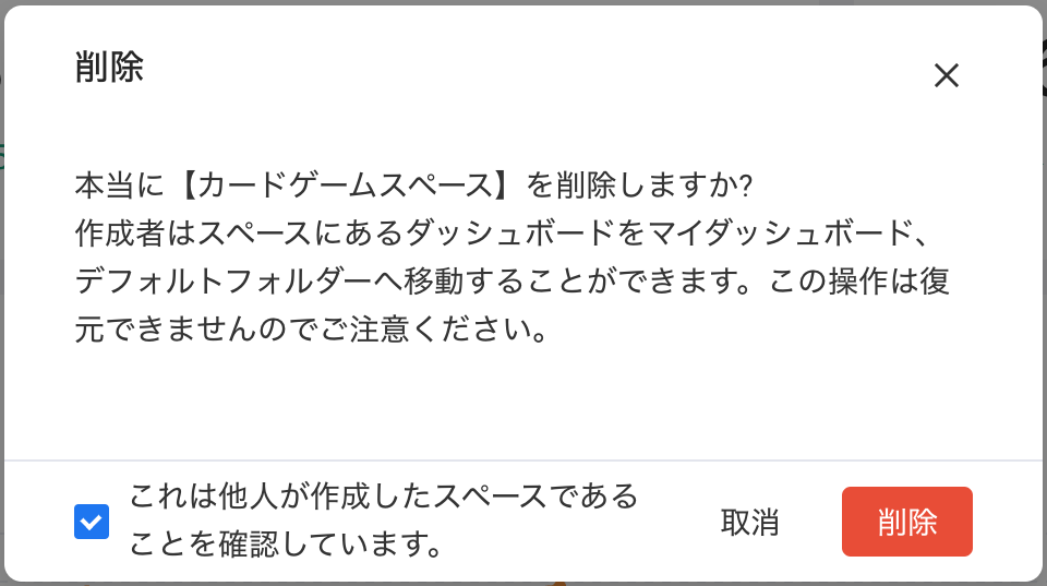 - スペースを削除してもダッシュボードは直接削除されません。削除後、スペース配下のダッシュボードはダッシュボード作成者の「マイダッシュボード>デフォルトフォルダー」へ移動されます。