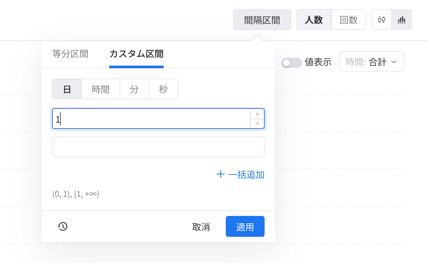 デフォルトの等分間隔以外にも、カスタム間隔を使用して非等分間隔の設定を行うことができます。まず、必要な間隔の単位を選択してください。日、時間、分、秒から選択することができます。次に各区間の境界値を設定し、プレビューエリアの下部にある範囲を確認してください。最後に、「一括追加」機能を使用して複数の区間を素早く作成したり、ウィンドウ左下隅の履歴ボタンをクリックして以前に使用したカスタム区間を表示および適用することもできます。