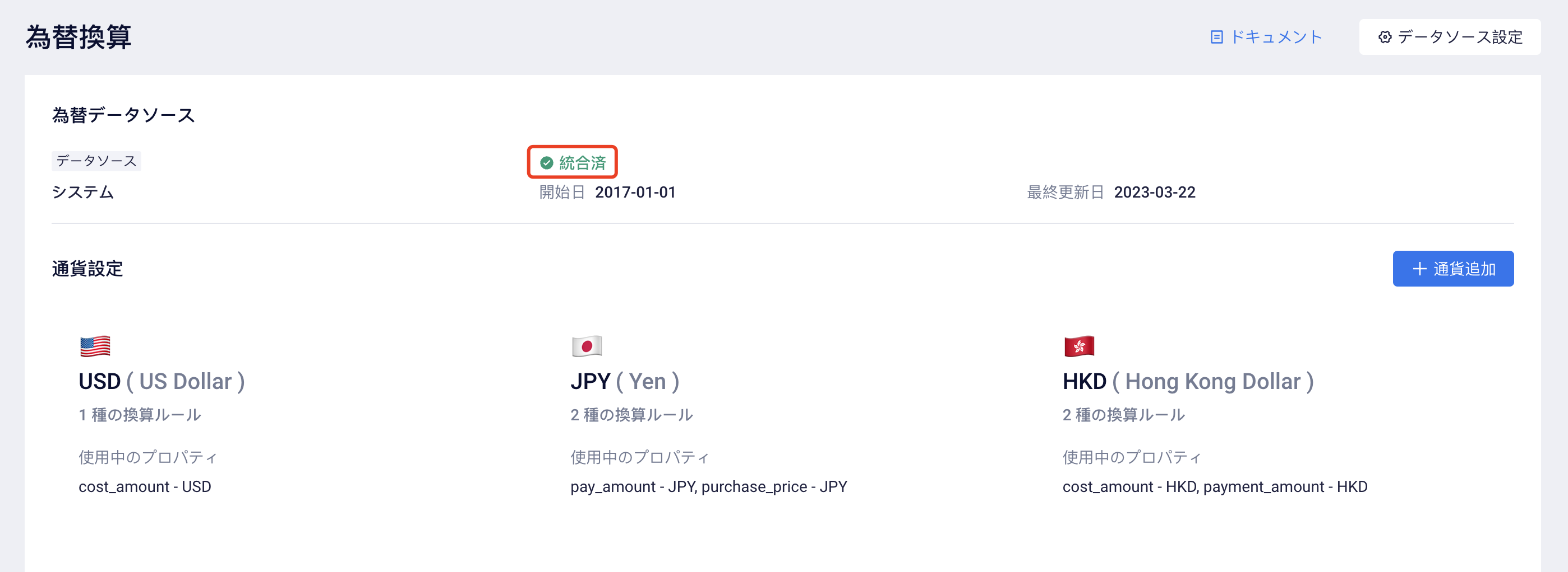 複数通貨を追加でき、該当通貨の各換算ルールは「換算通貨金額プロパティ」に対応し、データ-データ管理-イベントプロパティで確認および管理できます。