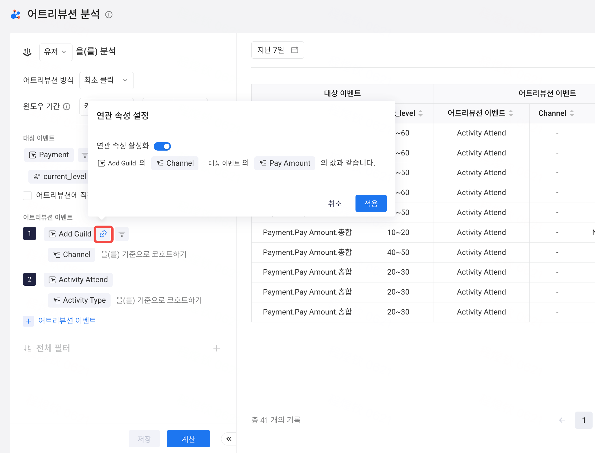 분석 주체, 어트리뷰션 모델 타입, 분석 기간을 선택하고, 타겟 이벤트의 지표값과 기여도가 할당된 어트리뷰션 이벤트를 정의한 후, 어트리뷰션 분석의 구성이 완료됩니다.