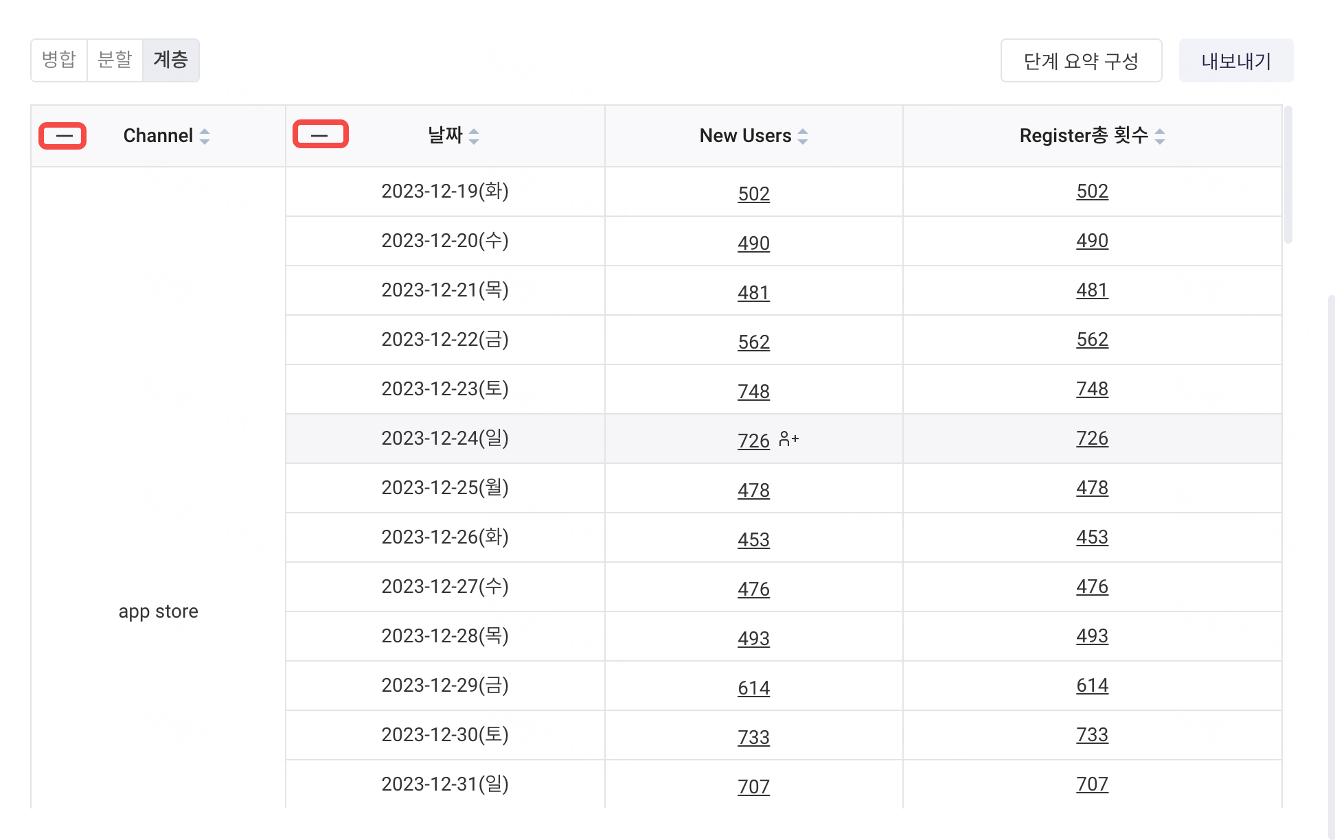 분석 지표를 구성 시 그룹 항목을 선택한 경우, '계층' 뷰를 사용할 수 있습니다. 모든 그룹 항목을 계층별로 펼치거나 접을 수 있습니다.