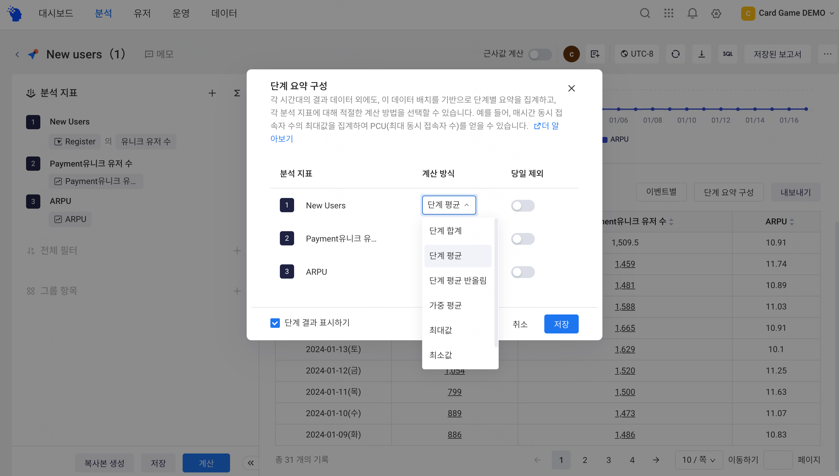 [합계]이외의 분석 계층에 대해, 이벤트 분석은 분석 지표별로 자동으로 집계됩니다. [집계 설정]을 클릭하면, 각 분석 지표에 적합한 요약 계산 방법이 선택 가능합니다. 설정 후에는 다른 날짜의 데이터를 포함하여, 각 날짜의 데이터를 기반으로 통계 기간에 집계된 데이터 결과도 표시됩니다.