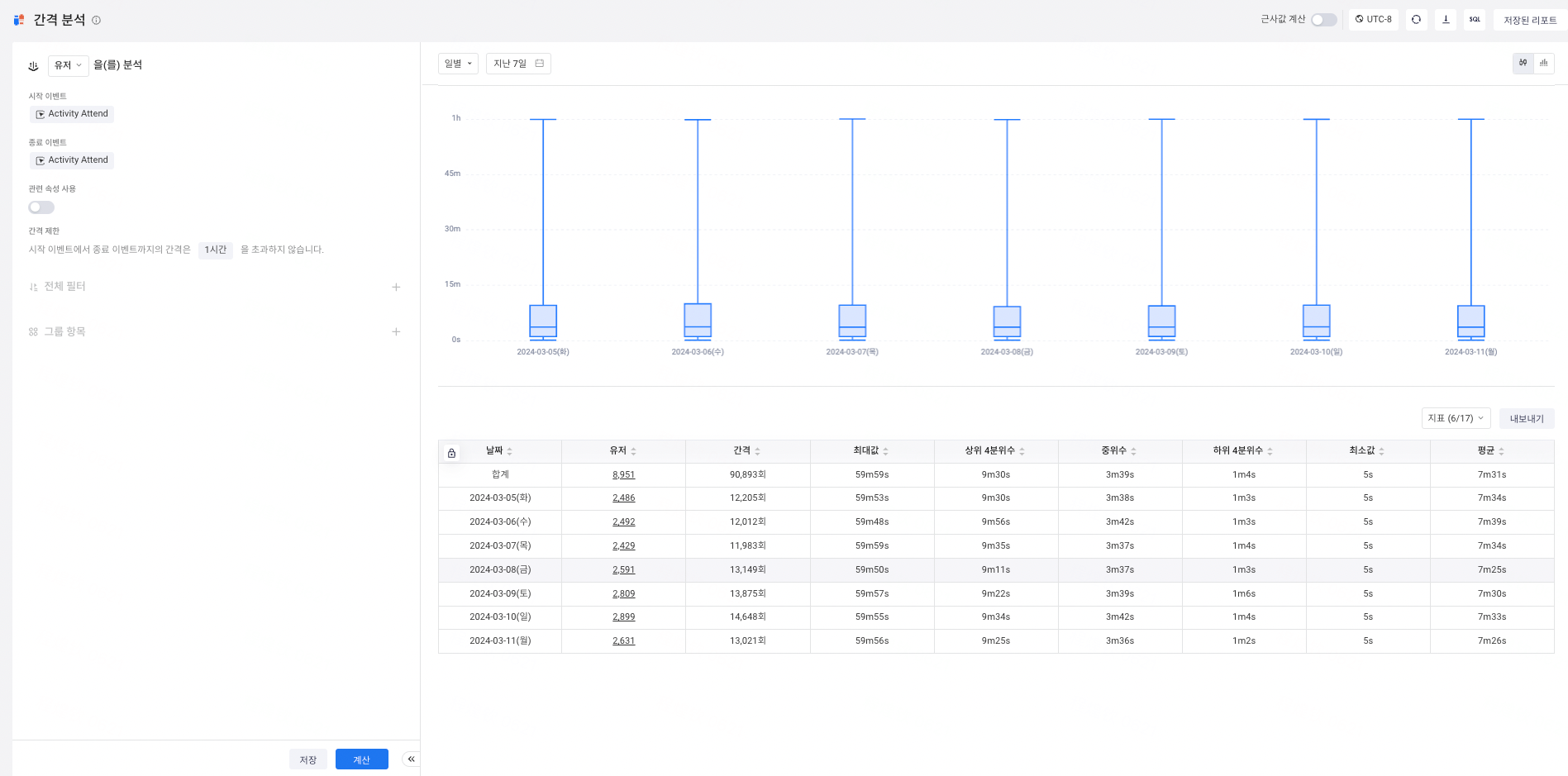 이벤트 간격의 집계 통계(최대값, 제1사분위수, 중앙값, 제3사분위수, 최소값 등)를 표시하려면 박스 플롯을 선택할 수 있습니다. 시간 단위를 합계를 선택하지 않으면, 박스 플롯은 날짜별 변화를 보여줍니다.