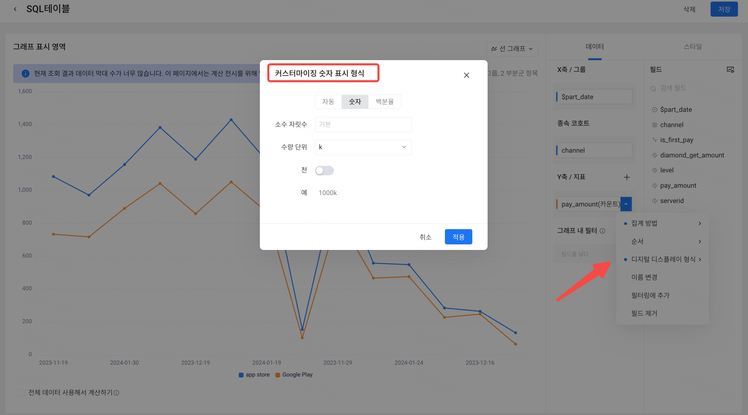 또한, 지표 필드의 데이터 형식을 설정할 수도 있습니다.