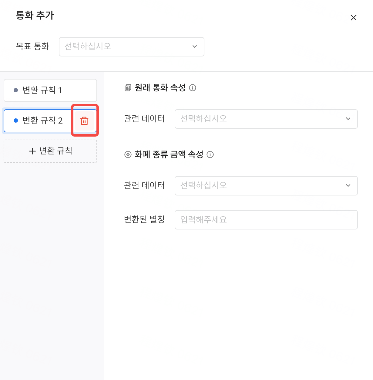 통화 카드의 삭제 버튼을 클릭하면, 환산 통화의 환산 규칙과 그 규칙에 따라 생성된 [환산 통화 금액 속성]이 모두 동시에 삭제되며, 복원할 수 없습니다.
