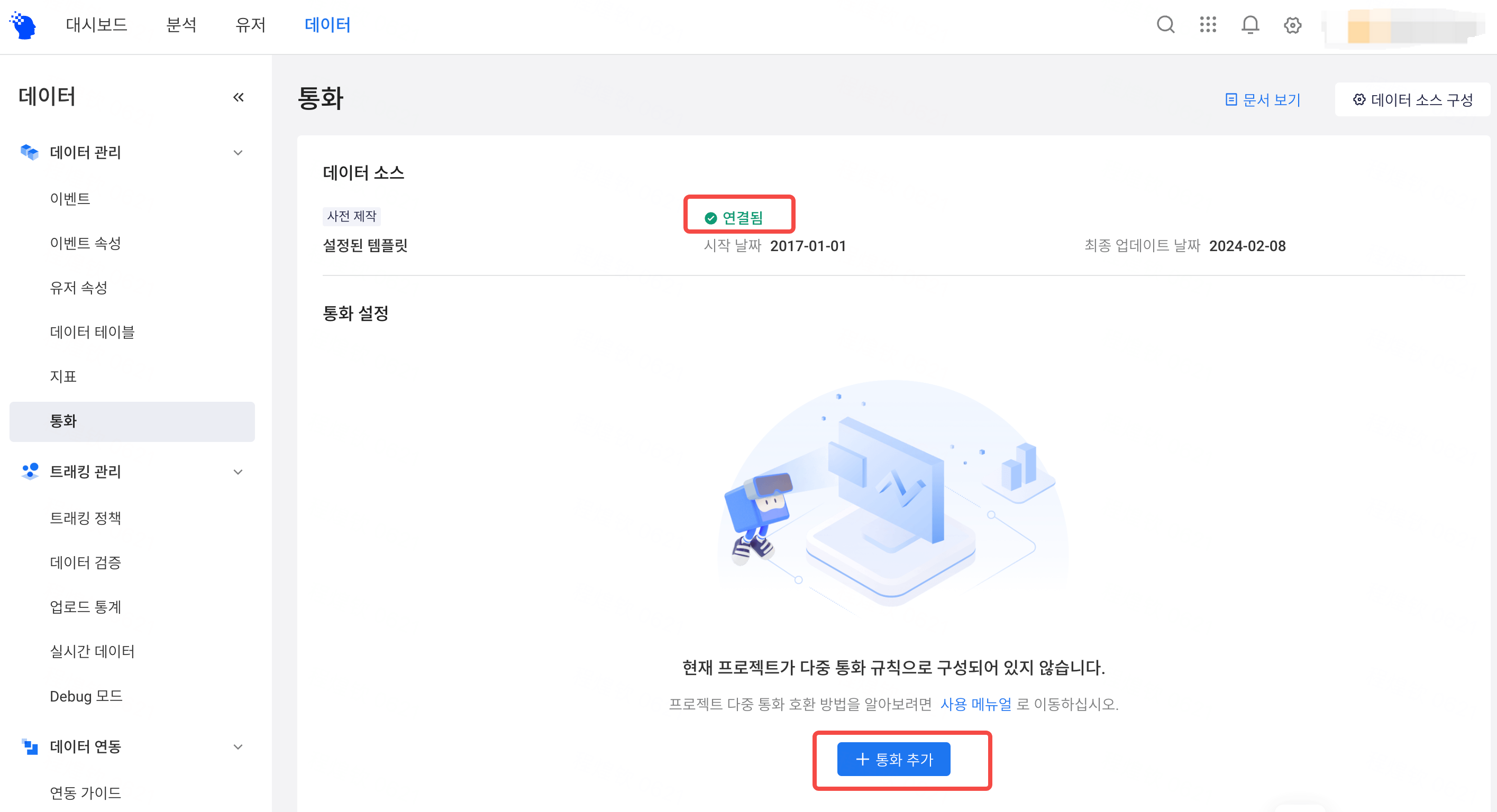 [데이터 소스 설정][설치 시작] 팝업에서, 원클릭으로 프리셋 데이터 소스 통합을 활성화하거나 비활성화 합니다. 상태가 연결됨으로 표시된 후 [+통화 추가]를 클릭합니다.