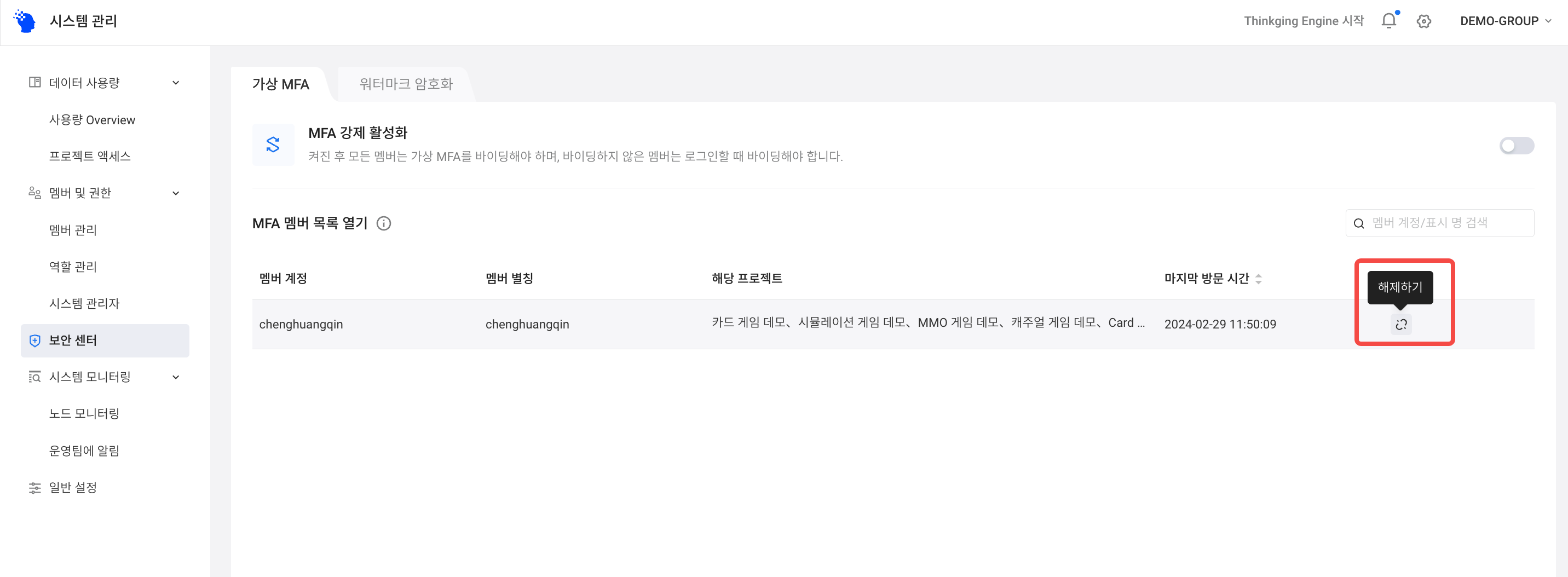 시스템 관리자는 페이지의 오른쪽 상단에 있는 메뉴에서 [시스템 관리] 페이지로 이동한 후 [시스템 보안]의 [가상 MFA] 탭에서 클러스터의 가상 MFA 상태를 관리할 수 있습니다. MFA를 강제로 활성화하거나 구성원의 MFA 연동을 해제할 수 있습니다.