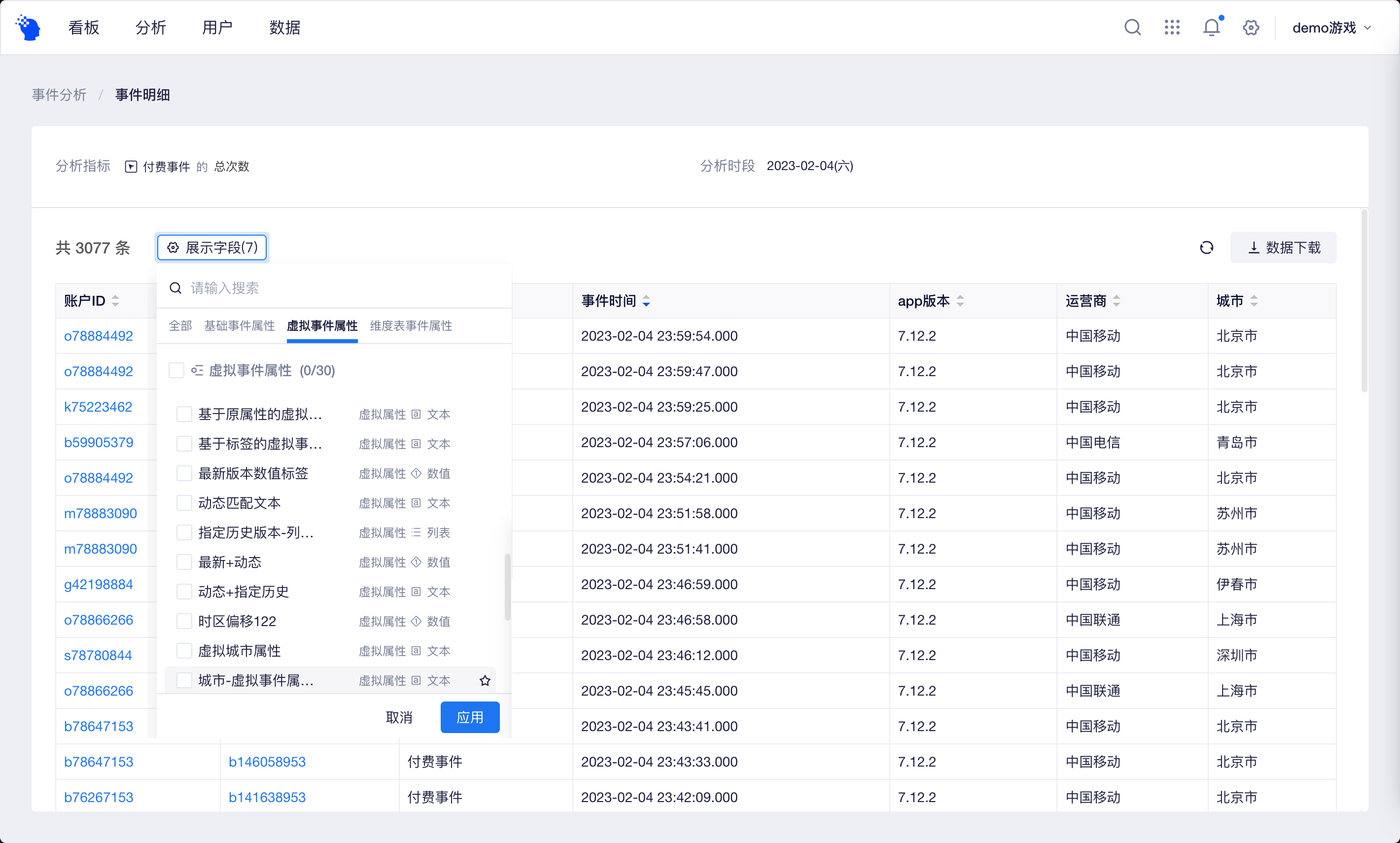 事件明细展示所选事件的详细信息,除了预置属性和自定义属性,您还可以选择事件关联的虚拟属性和维度表属性,事件属性将以您点击勾选的顺序展示在表格中。