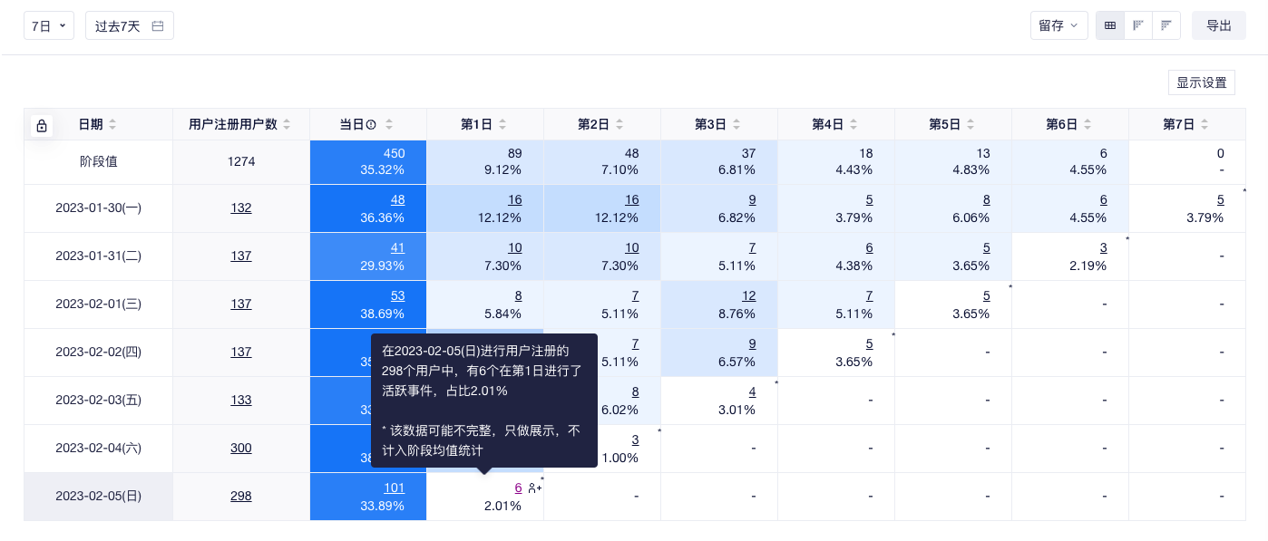 每个单元格展示在某个初始日期下,第N日的留存人数/留存率,鼠标移动上去可查看对应说明。根据留存/流失率的大小,每个单元格都会用不同深浅的蓝色填充,方便您快速定位异常日期。