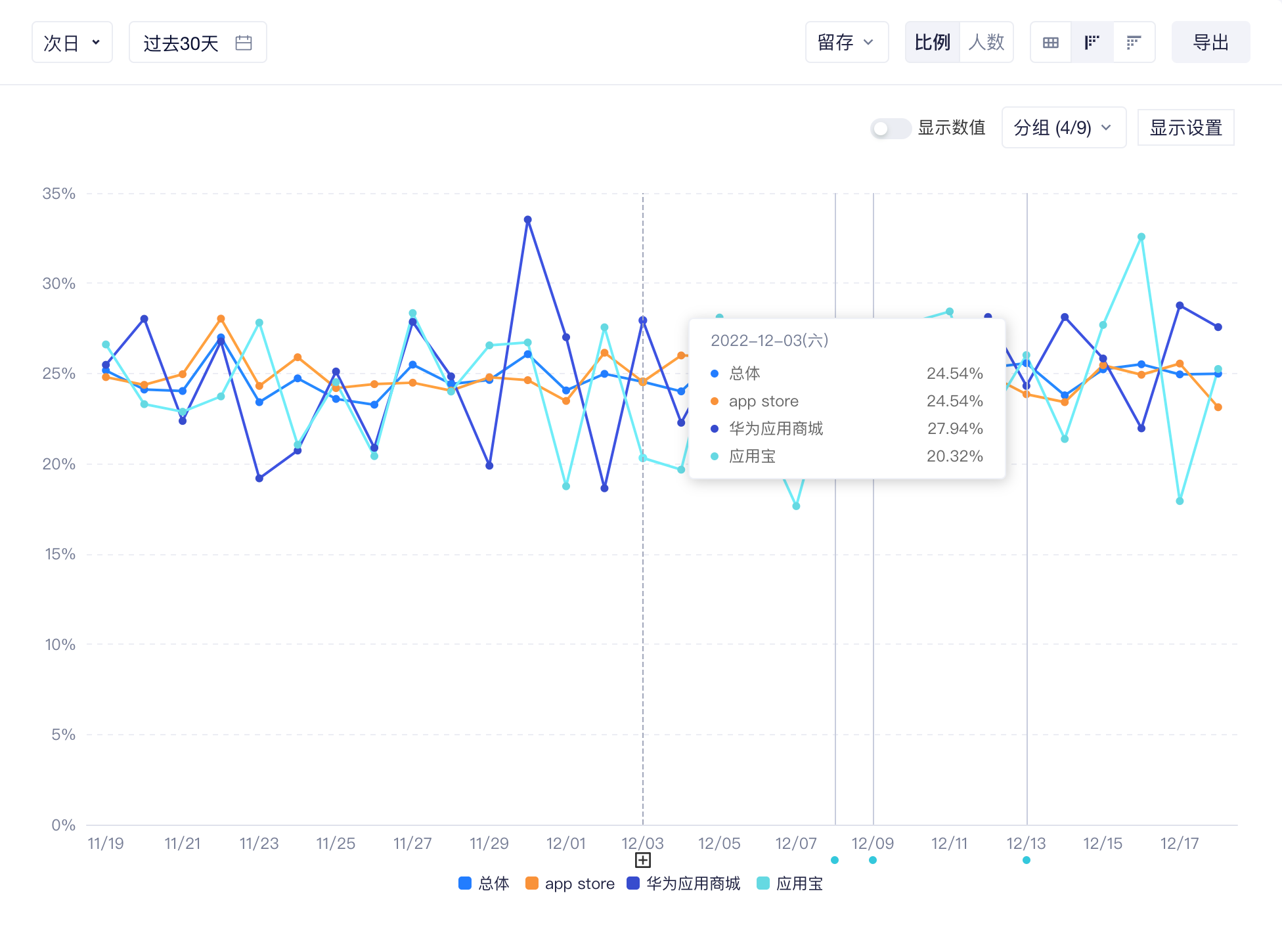 和第N日留存不同,每日留存的X轴为第N日,每条折线代表一个初始事件日期。如果您有配置分组项,则每条折线代表一个分组项的阶段值数据。