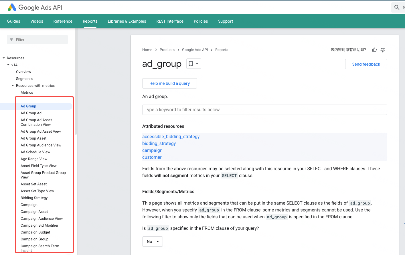 首先,进入到您需要接入的 Resource 页面,点击顶部的「Help me build a query」进入到 GAQL 编写辅助页面