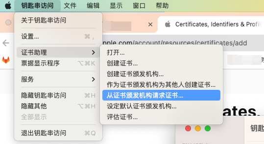 使用“钥匙串访问”--“证书助理”--“从证书颁发机构请求证书...”