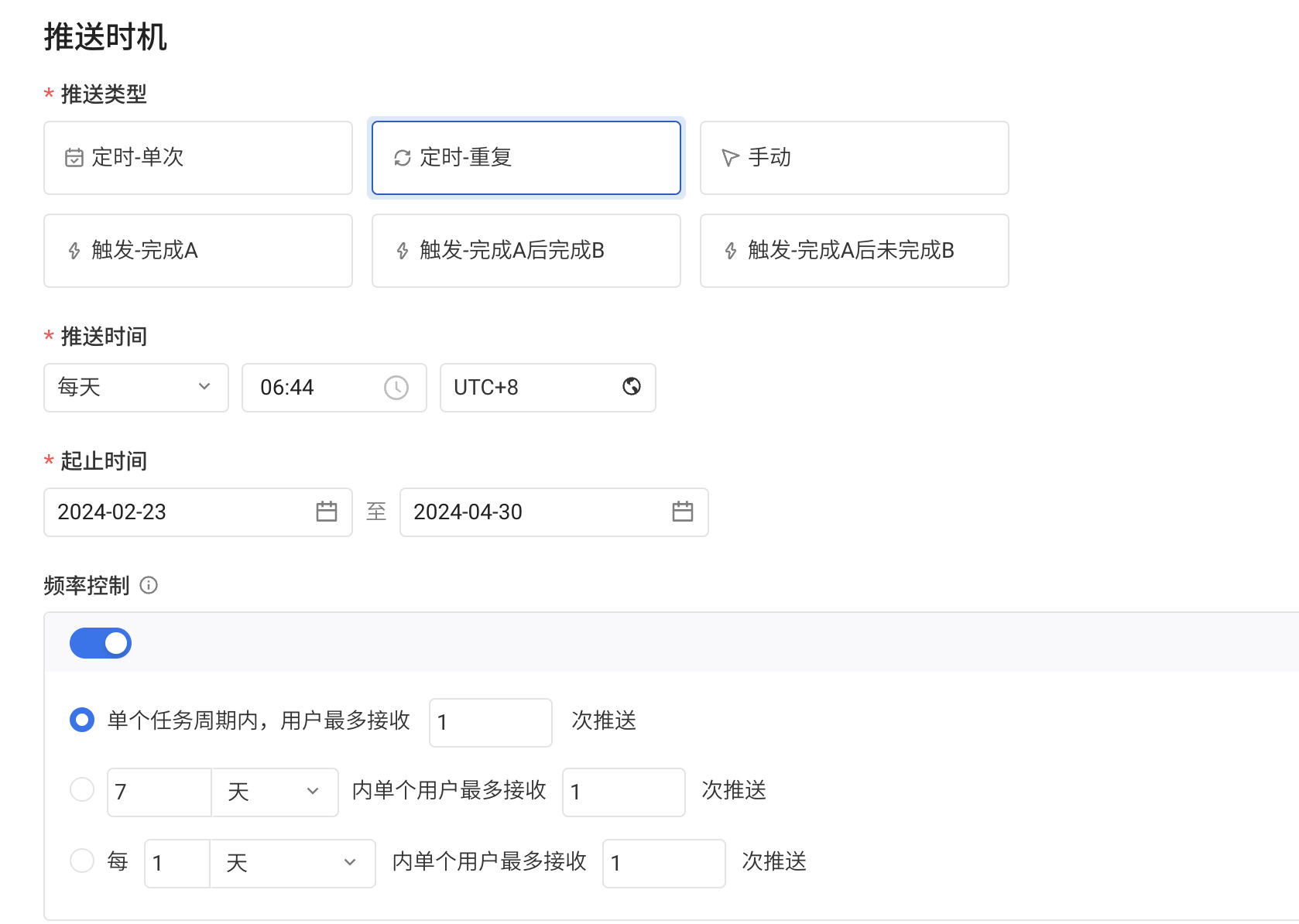 推送时机:支持定时-单次、定时-重复(每日/周/月)、手动、触发式推送等多种推送类型