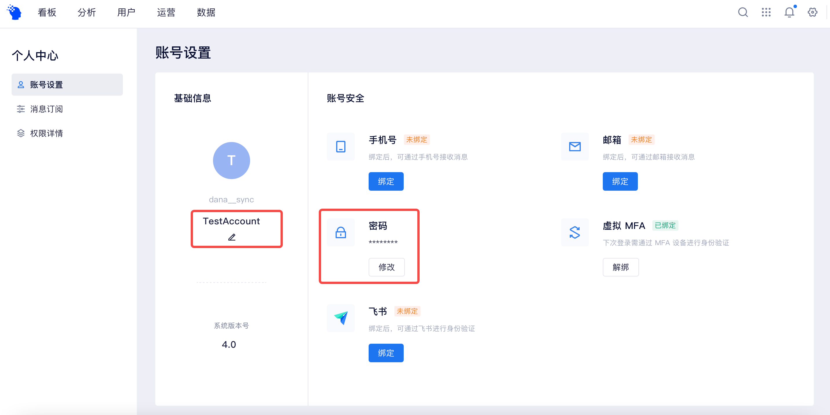 您可以在个人中心修改显示名、密码。忘记密码导致无法登录或无法修改密码时,您可以联系超管,由超管修改您的密码后,重新尝试登录或修改密码。