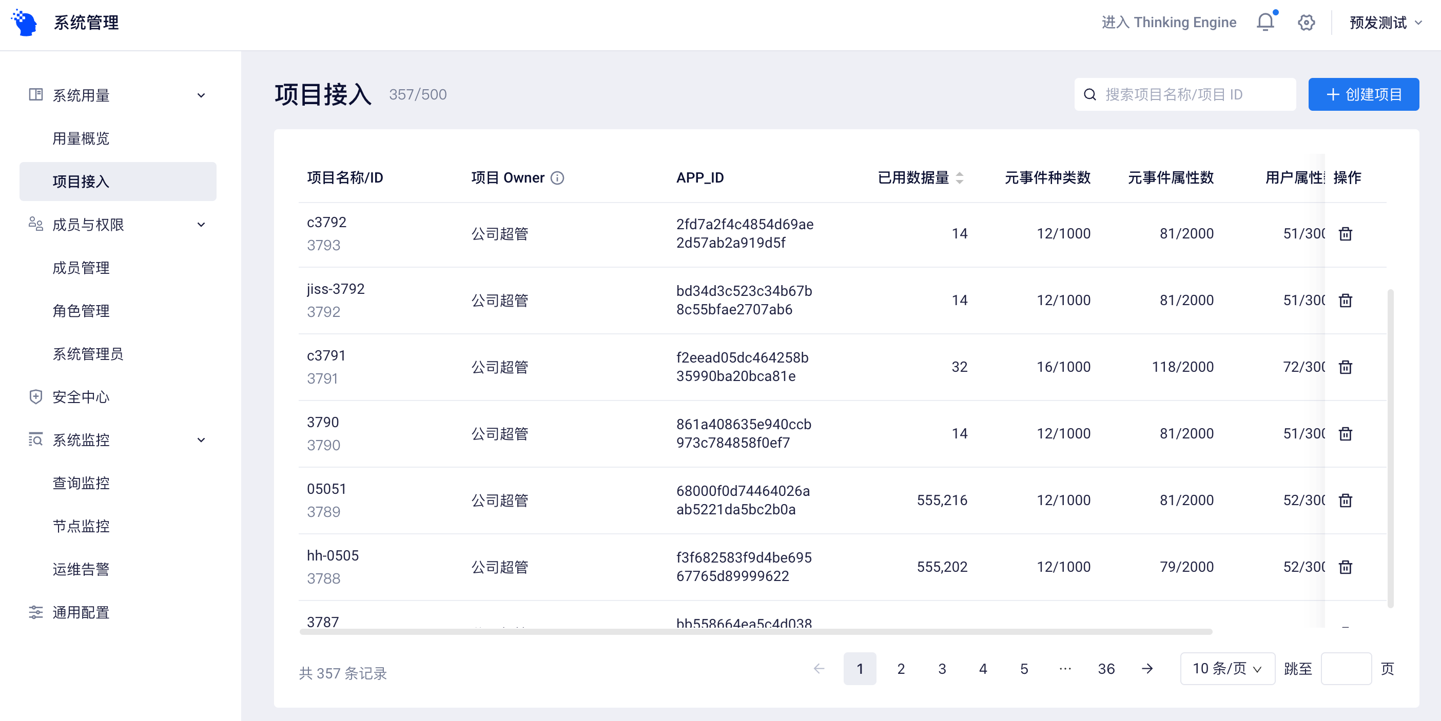 在【系统管理-系统用量】下的【用量概览】和【项目接入】页面,您可以查看当前TE系统的数据量使用情况并管理系统内的全部项目。超管和有“新增项目、查看接入详情”权限的系统管理员可以进入相关页面。