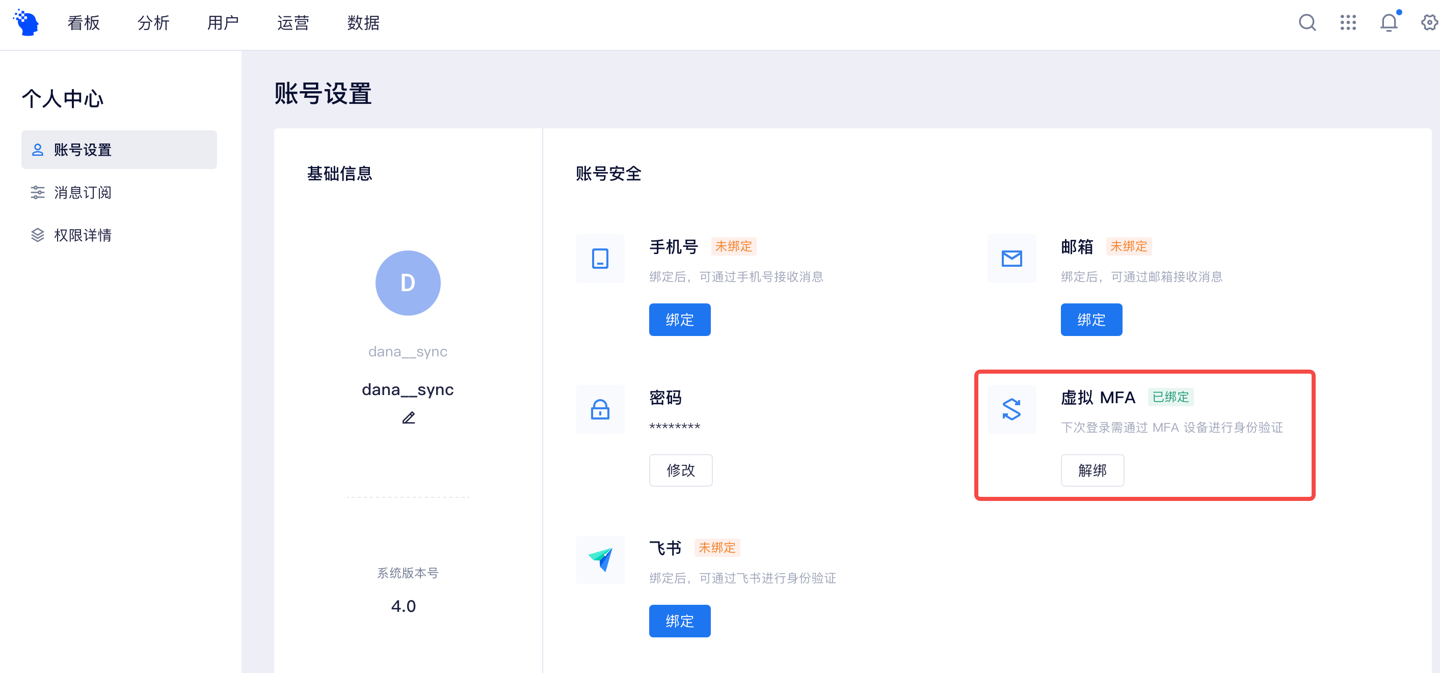 如果需要关闭MFA,则同样在「账号安全」栏目下的「虚拟MFA」条目,点击「解绑」进入关闭MFA的流程: